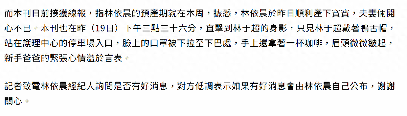 媒体还目击林依晨老公林于超带着鸭舌帽现身月子中心,神情紧张。