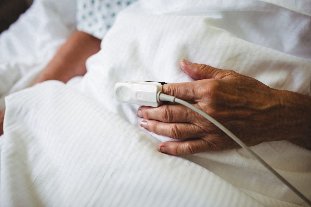 第一张图中的第二行蓝色部分,包括两个部分,前面的波形和后面的数字。这是一种通过无创的末梢血氧饱和度监护,能够实时的监测人体血液内“氧气含量”。人在呼吸的时候空气吸入肺内,在肺泡内完成气体交换,空气中的氧气溶解进入血液,与红细胞上的血红蛋白结合,血液中的二氧化碳变成气体随着呼吸呼出,血液携带氧气进入各个组织器官,在组织内血液内的氧释放,回到静脉后氧饱和度就下降了;正常人氧气溶解在血液后会形成一个“氧分压”、“血氧饱和度”,这是重要的生理参数;血氧饱和度指的是被氧分子所氧合的血红蛋白占总血红蛋白的比例,正常人动脉动脉血氧饱和度大于98%,静脉血氧饱和度约75%左右,这种采用近红外感应的监测仪器(指套式),测量值接近动脉血氧饱和度。左边的波形与前面提到的心电图波形是同步的,也就是说没心跳一次,末梢血管搏动一次,就能够监测一次血氧饱和度。患者家属需要关注什么?右边的数字!正常值为98%--100%,如果低于95%为异常,要预警了,需要通报护士或者医生,由他们进行判断并进行处理,低于90%缺氧就比较严重了,患者可能会烦躁,要“拉响警报”,低于85%或者80%属于重度缺氧,患者可能出现甚至淡漠、甚至昏迷。