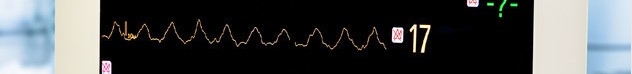 第一张图中的第四行黄色部分,包括两部分,前面的波形和后面的数字。正常成年人的呼吸频率为12-20次/分,安静时呼吸频率和幅度规整,吸气一次和呼气一次称为一次呼吸。通过电极、导线可以监测出呼吸频率的快慢,不过这一条监护的用处相对比较小,因为如果一个患者呼吸频率加快或者明显减慢的话非常容易被肉眼察觉到,就像我们刚跑完步一样呼吸很快一眼就能看出来。